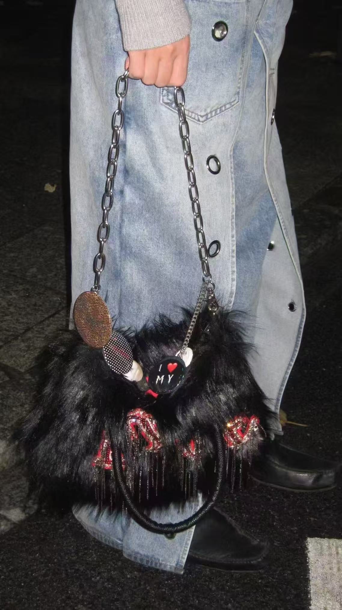 striking black faux fur bag featuring a prominent "LOVE" design adorned with sparkling rhinestones and dangling chains.